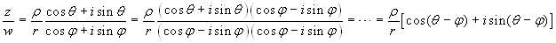 Dati due complessi z=x+iy=ρ(cosθ+isinθ) e w=s+it=r(cosφ+isinφ), calcoliamone il prodotto e il quoziente, considerando la forma trigonometrica: