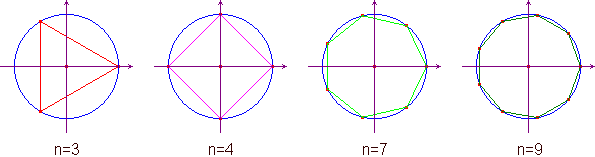 Ora tutte le radici n-esime (qualunque sia n) hanno modulo 1 e quindi nel piano di Gauss si situano sulla circonferenza di centro l'origine e raggio 1. Inoltre, poiché 1n vale ovviamente 1, il numero 1 stesso appartiene all'insieme delle radici n-esime, per ogni n. Se si osserva che gli argomenti delle radici sono, nell'ordine, 0, 2π/n, 3π/n, ..., (n-1)π/n, si conclude subito che esse si situano sui vertici di un poligono regolare di n lati, inscritto nella circonferenza e con un vertice nel punto (1,0). Questa osservazione riconduce il problema del calcolo esplicito delle radici in forma algebrica a quello generale della ciclotomia.